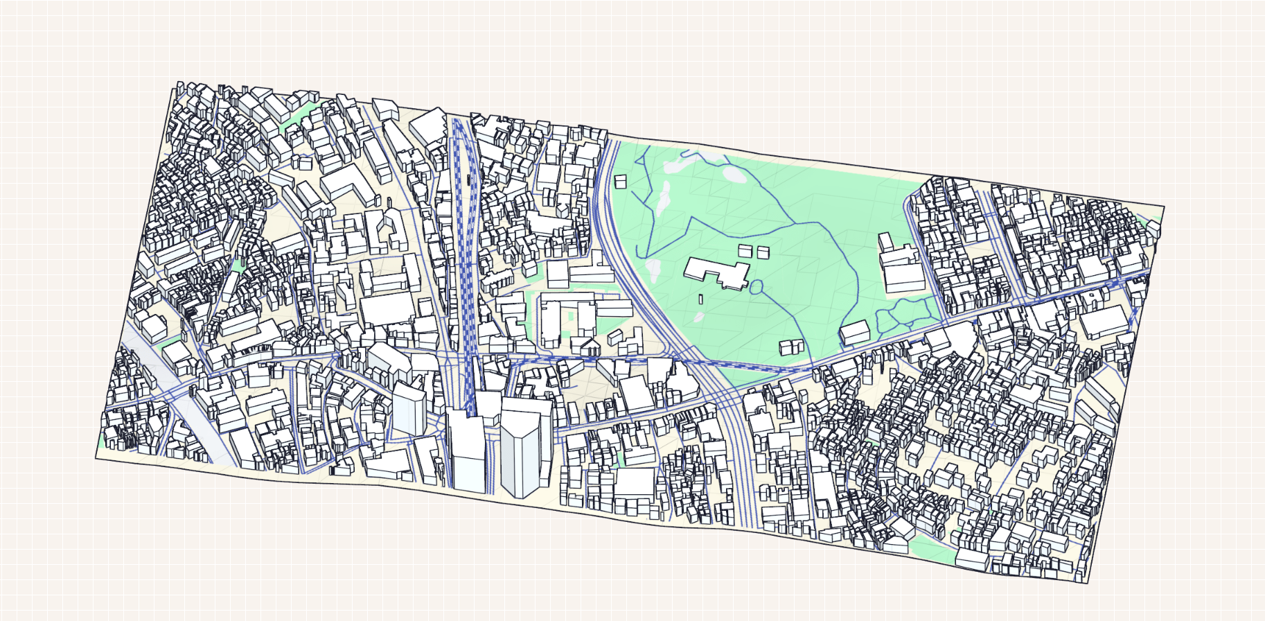 Settings: Road centerlines, 3D buildings (no value = 50.0 m)